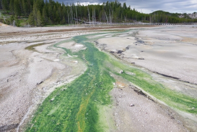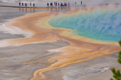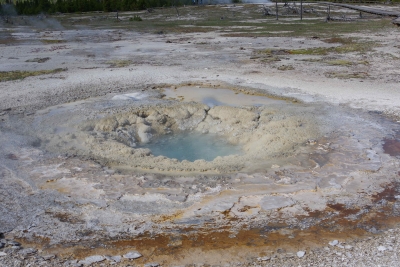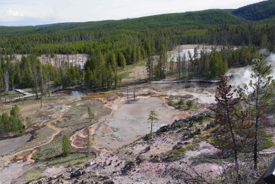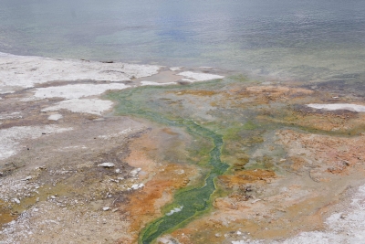These are some mud pots. I have a video of them bubbling up. First thing I thought of was spa material facials. But, sadly, these guys are a bit toxic for that. At a later spot we witnessed our first (mini) geysers. The one in the front was probably 4-10 feet high. The one in the back was a little taller but more spread out. I think the one in the back was called the whirlygig geyser. This is all part of the Norris Geyser basin. I caught a couple of colorful drainage views showing the vast array of colors.