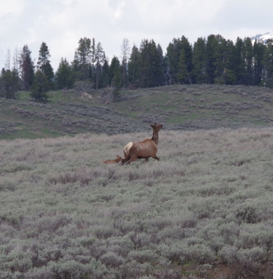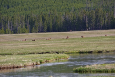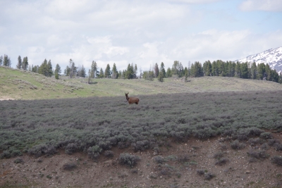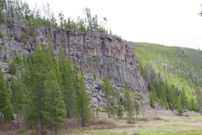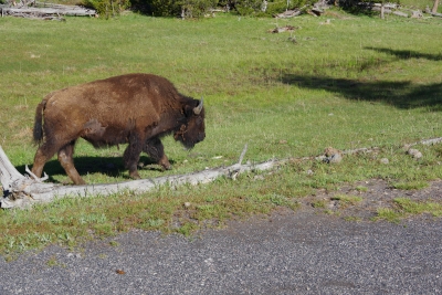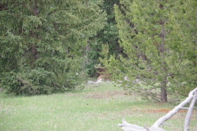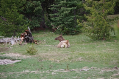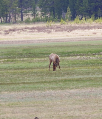 Leaving that site, we headed south in the loop and stopped at the Obsidian Cliffs. The rock from these cliffs were used for thousands of years by the natives, predominantly for arrowheads and knives. But in the last 20 years all paths that come close to the cliffs have been closed because of the damage done by tourists in climbing and collecting rock samples. Our path for the view was on the other side of the roadway. And as we finished out loop, we were given a good night farewell from an elk munching on her dinner.