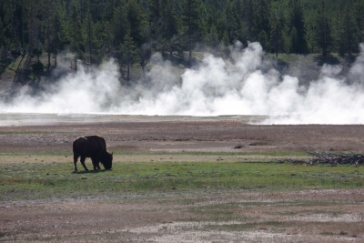 We discovered that the park built a trail to an overlook to get a more photogenic shot of the Prismatic. On the way, this bison walked alongside me. I know, I'm supposed to keep a healthy distance form the bison, but he walked at my pace and kept looking at me, so.... Jim ran away from the bison on the other side. Not saying that he's faster than a bison..... At the top the view was good. The steam downgraded the awesomeness but it was worth the hike.