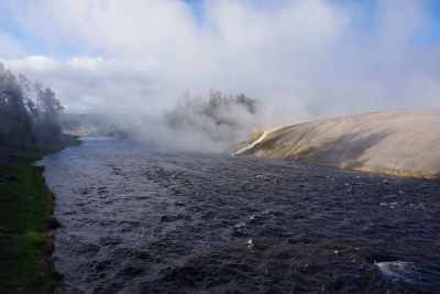Saturday, June 1. 2024 Today we attacked the Yellowstone Lower Loop. We started early in the morning. This was good becasue we wwere ahead of the crowds. This was bad because the morning temps (38 when we started) created a lot of surface steam that clouded a lot of the pictures. Firehole River runs through the Midway Geyser Basin. The runoff from the Basin entering the river created an enjoyable early view.