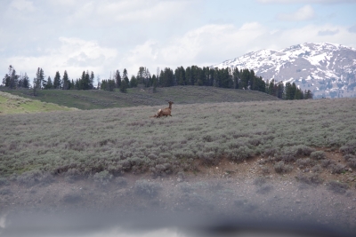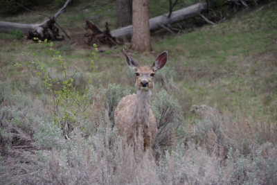 we made a stop for ice cream and a veteran raven paid us a visit. Very photogenic. But some of the locals weren't really interested in posing for pictures. This black back was probably 500-600 yards away. Fairly oblivious to us. We received numerous warnings about avoiding bears. Any walk off the roadway introduced the opportunity to meet up with a bear. The grizzlies were the highest risk, but since this was early in the season, any momma (bear, elk or bison) will do anything to protect her cubs. So of course we took a 1 mile hike off the roadway to get a picture of one of the many waterfalls. My head was on a swivel, the rest of our group was comfortable with me in the lead. They figured it would take a while to eat me, giving them time to escape. So I rounded one curve of the path and came face to face with.... this deer. And when I say face to face, we were probably 4 feet away from each other. I politely asked if I could take a picture. She obliged. I proceeded on my hike knowing a) regardless of how attentive I was, the odds were high that wouldn't see anybody until too late, 2) if that deer was that comfortable, there probably weren't any bear in the area.