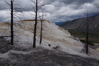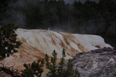 And then I got to the Undine falls. Dawg maintained a watchful eye. He even got compliments from some of the other tourists. Speaking of falls, this is a pic of the Wraith Falls. We got to the Mammoth Hot Springs section later in the day. These views were spectacular. Haven't used that word much. Our opening shot was of the minerals forming a cascade of white and rust colors. There was a constant water flow mostly from the springs along the top.