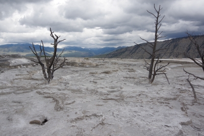 The sediment buildup and chemical content killed a numebr of trees as it crept along the surface. This lonely tree marks its advance. Jim's bison went further out to get a bite to eat. My bson was exhasted from keeping pace with me and laid down for a nap. More Biscuit pictures.