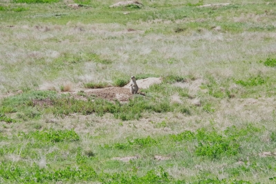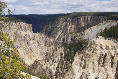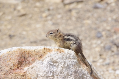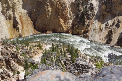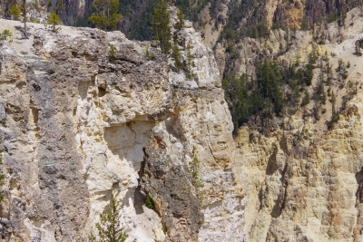 Our treat for this walk was a lounging elk. If you look REAL close you can see the male hiding in the trees. Wildlife break over, back to lake, geyser, spring and holes. Oops and one squirrel trying to survive in the basin. Okay, so this hole is just off the beach (if you want to call it that). The story is that the native Americans would go out on the lake, catch fish, bring them back and cook them in the hole. Pretty efficient use of the environment I'd say. Another wildlife break. We saw this antelope being extremely wary of the traffic. Lisa grabbed a couple of shots, noticing (in the second frame) that there was a baby in tow. I enlarged the pic for you peeps with poor eyes. A couple miles north and we hit the Grand Canyon of the North. Have I overused "spectacular"? I captured a tree living on the top of a rock on the top of the cliff. And, Good Night Squirrel. He was sitting on rock within a foot of the edge of my last walkway.