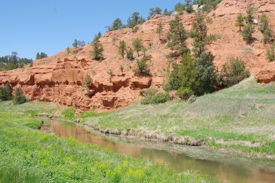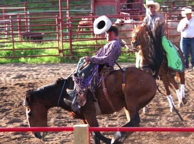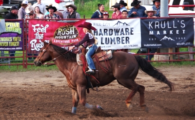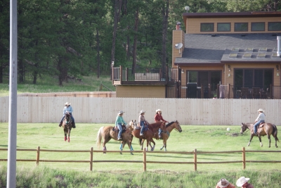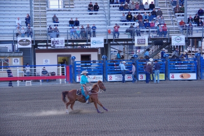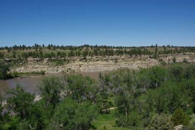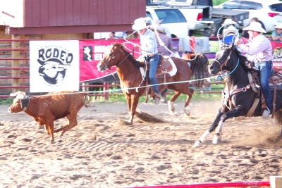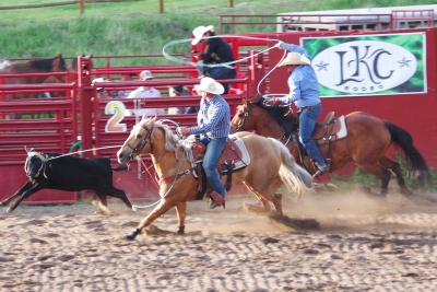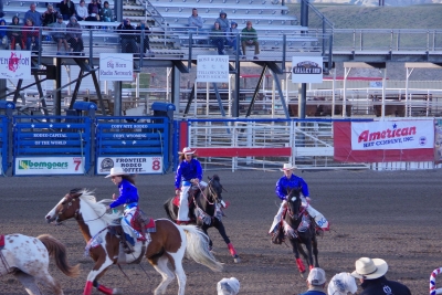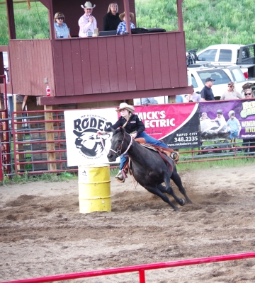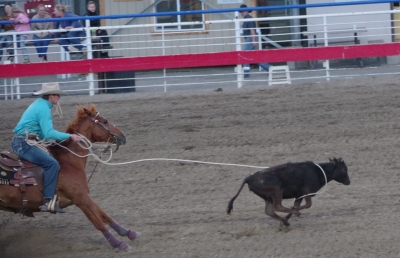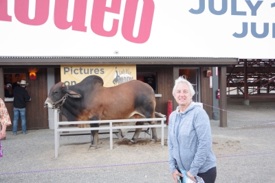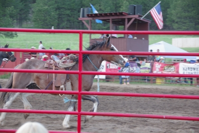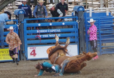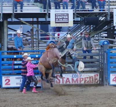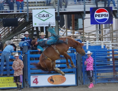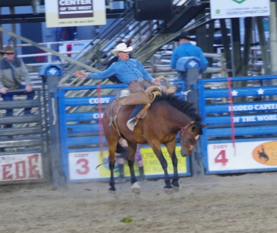 The canyon. And the Shoshone River. We played tourist during the day, leisurely walks through town. And a visit to the Buffalo Bill Museum. There are actually 5 museums in the facility, each one credible as a stand alone museum. I liked the gun and rifle museum, phenomenal collection. The Cody museum was good, providing a lot of insight into his background. And I was very impressed with the Plains Indian Museum. Well done with excellent historical and contemporary sections. We had dinner at Irma's. Irma's is a hotel actualy built by Cody (Buffalo Bill) himself. After dinner we stayed for a shoot out. Some locals put on a display of characters from the Wild West. It was their final dress rehearsal. Let's just say that it's going to be a long season for the tourists. The best line of the night was the emcee stating that he was proud of Wyoming, the first state to allow women to vote, the first state to elect a woman as governor, and the first state to hang a woman. They picked a young kid out of the audience and put him in the jail. Charge - real cowboys don't go by the name of Braxton. Our last stop was a show at the local rodeo, "the best in the world". It was amateur night so we didn't get the best of the best, but it was very entertaining. Upon entry, we were offered a chance to sit on the broncing bull. We passed, but I got Lisa close enough for a pic. The star attraction was the host for the night. He was the ultimate professional, with everthing memorized (including in-show ads for about 40 sponsors, he knew them all and sold them with vigor). He had the main clown as a side kick that wandered in the arena, outside the fence, and amongst the crowd. The two of them played off each other very well. He also took up a dare and used his horse to rope a calf. Impressive. He also led us in prayer (multiple times).
