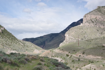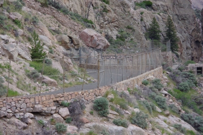 The dam is located at the end of the Shoshone canyon. Our first introduction is the road behind the dam that was the first raod created in the pass. It's since been replaced by a "comfortable" two lane road that winds through the canyon and goes through a couple of tunnels. If you look closely at this picture, you will note that it's barely one lane. There is no way we could pull the RV through these bends this close to the edge. Well, I could, but Lisa would have a heart attack.